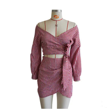Chiffon Checkered V-Neck Skirt Set
